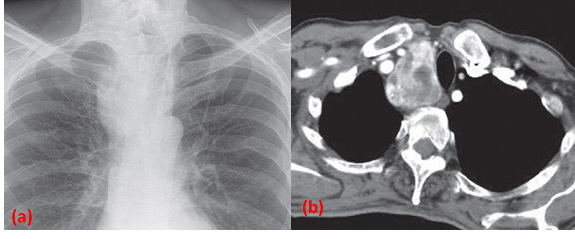 (a) X-Ray showing a large, right-sided, superior mediastinal mass displacing the trachea.