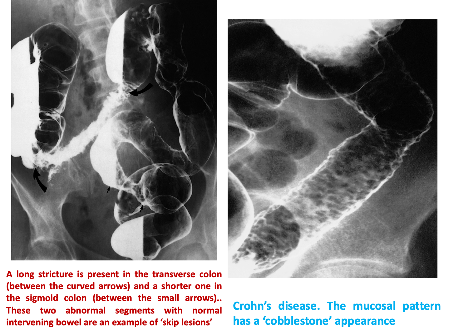- Colonoscopy and biopsy: Skip lesions, cobblestoning, transmural ulcers