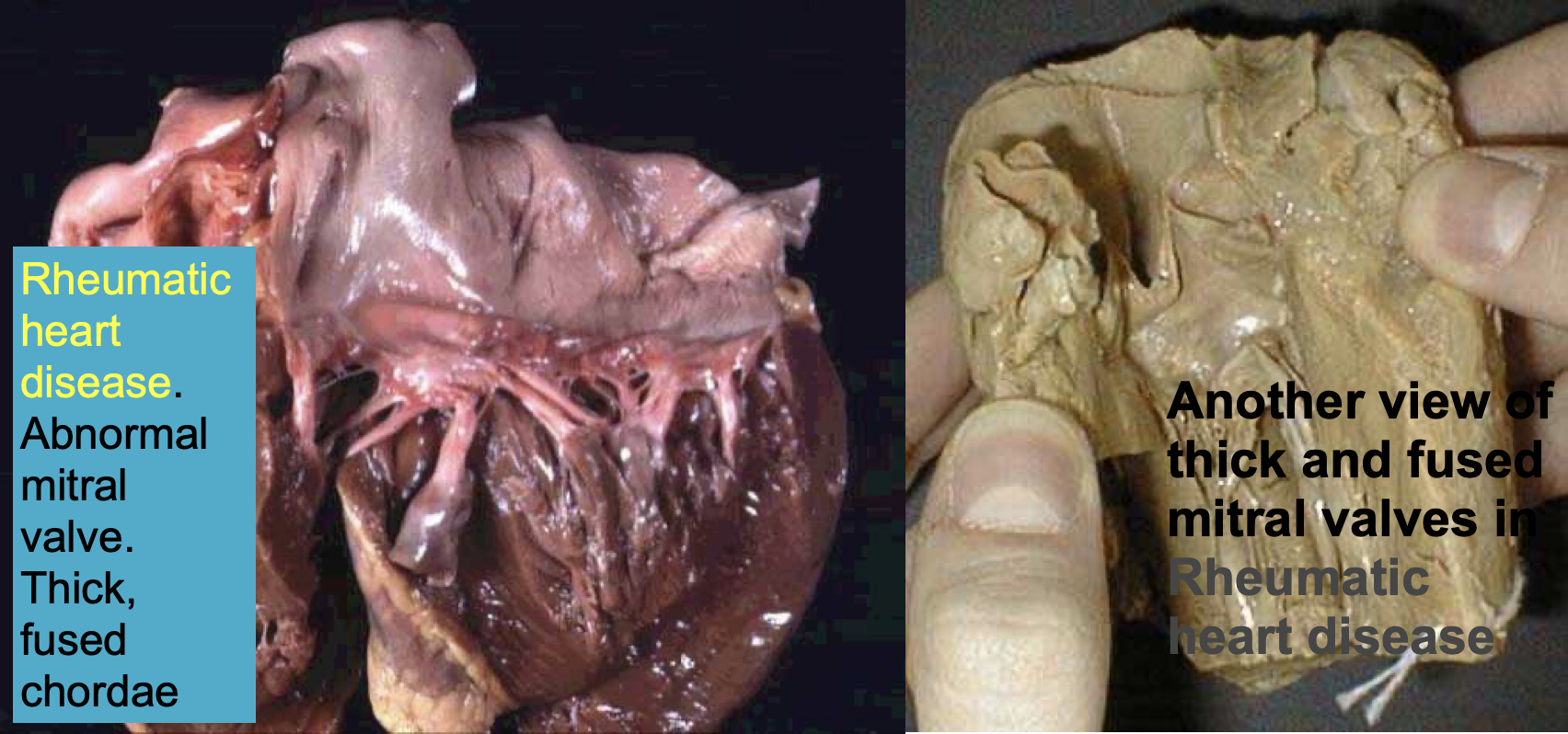 - Chronic phase- fibrosis, calcification & stenosis of heart valves (fishmouth valves) -