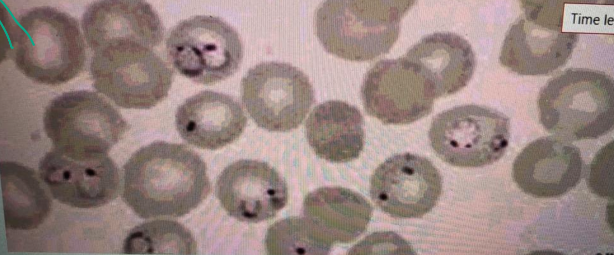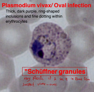 Thick, dark purple, ring-shaped inclusions and fine dotting within erythrocytes. “Schüffner granules” (very specific if seen in blood film, suspect vivax-oval)