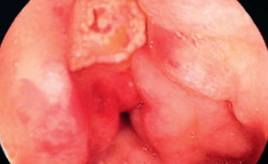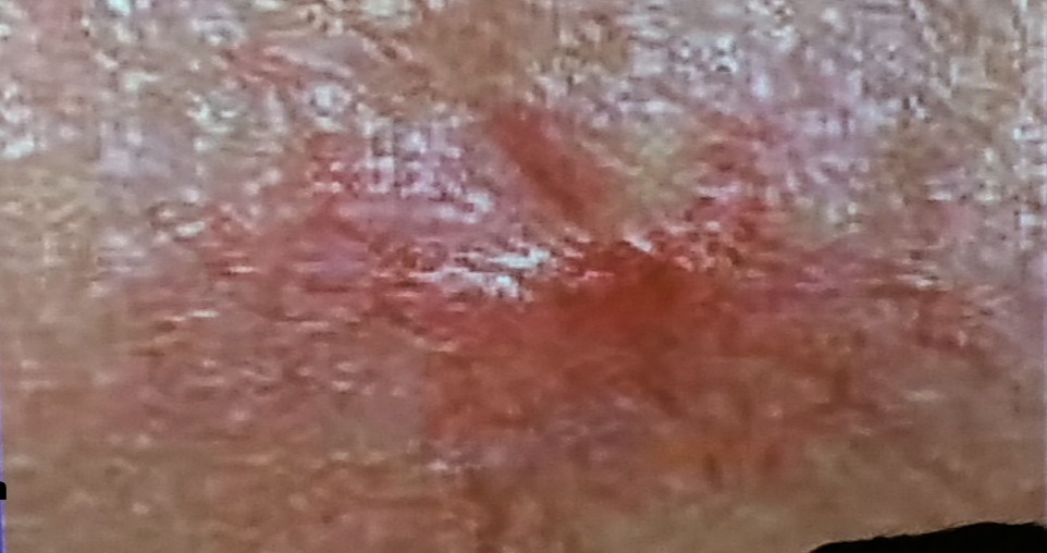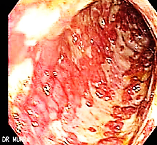 This is an endoscopic image of colon affected by ulcerative colitis. The mucosa is blotchy and broken in many places.