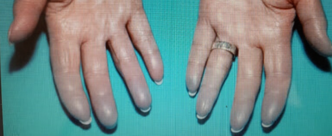 This patient had long standing skin condition as shown in clinical photograph. She developed deformity in joints as shown in photograph.