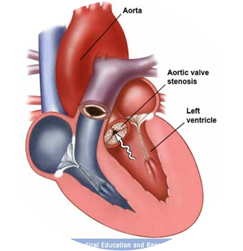 Narrowed opening area of the aortic valve during systole → obstruction of blood flow from the left ventricle (LV) → increased LV pressure → left ventricular concentric hypertrophy, which leads to: Increased LV oxygen demand. Impaired ventricular filling during diastole → left heart failure. Reduced coronary flow reserve. Initially, cardiac output (CO) can be maintained. Later, the decreased distensibility of the left ventricle reduces cardiac output and may then cause backflow into the pulmonary veins and capillaries → higher afterload (pulmonic pressure) on the right heart → right heart failure.