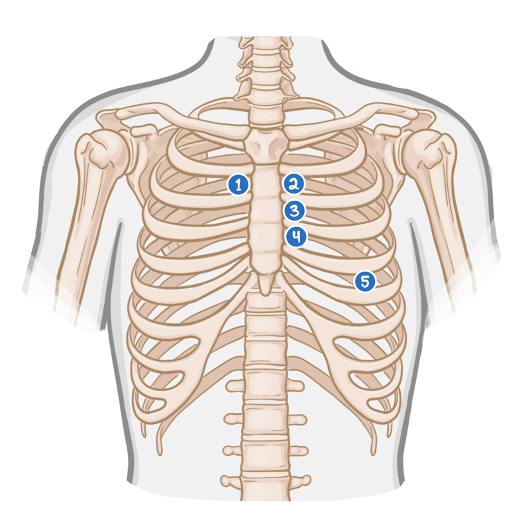 - Area 2: Ejection murmur accompanied by a fixed split-second heart sound (S2).