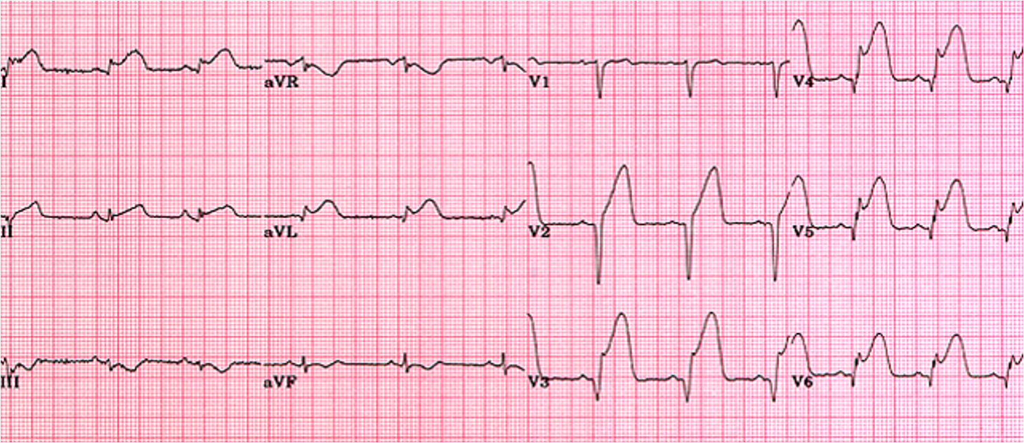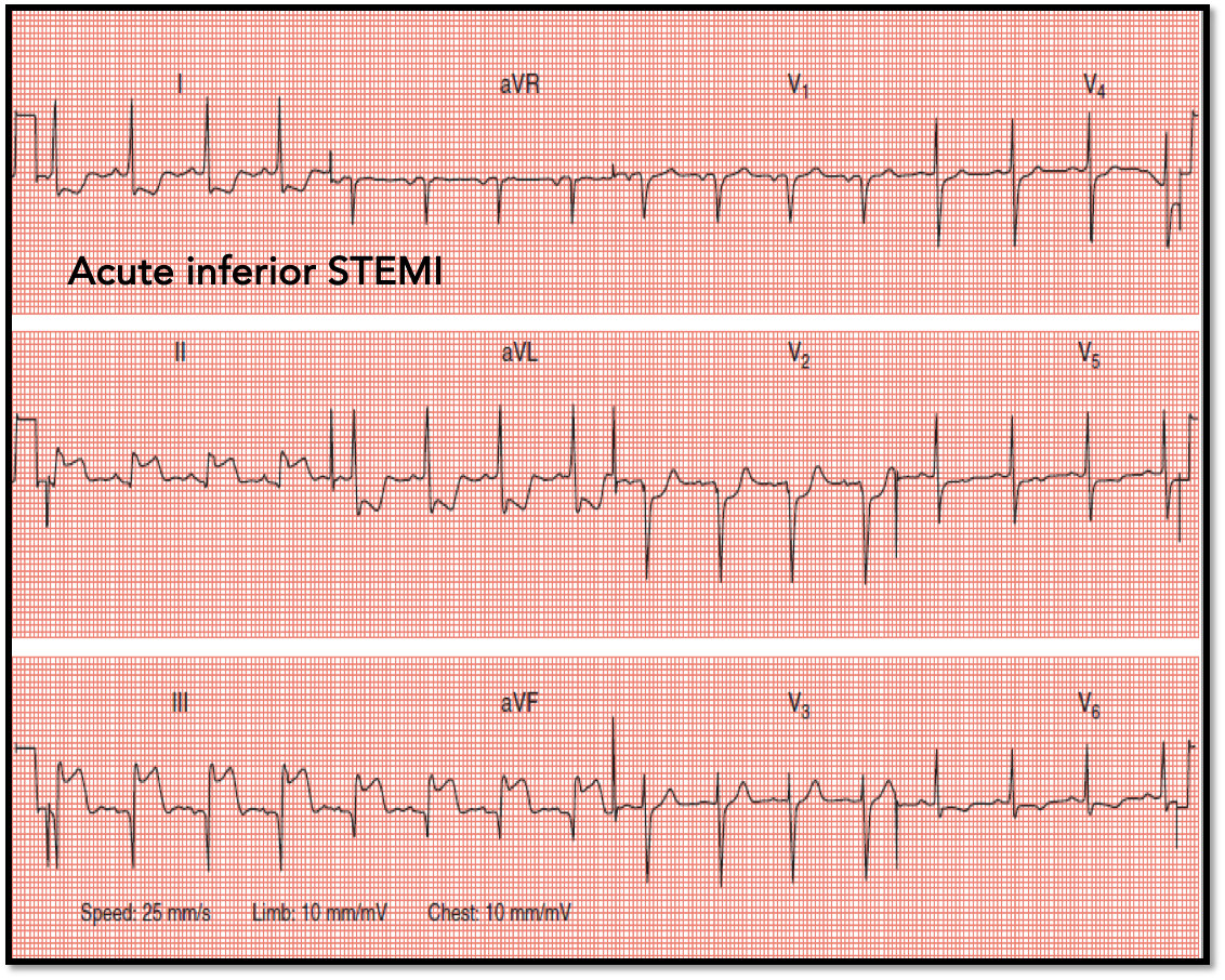 A 75-year-old man presented with a 2hour history of crushing central chest pain. He is known to be an ex-smoker, hypertensive and diabetic on medications. Physical examination was unremarkable. His ECG is shown