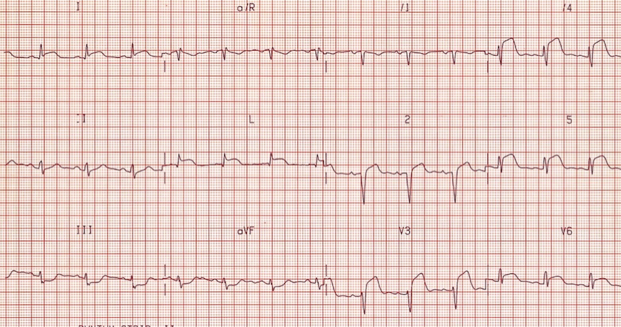 A 50 year old smoker with hypertension develops central crushing chest pain radiating to his jaw. He has vomited and now feels short of breath. ECG was done which is shown.
