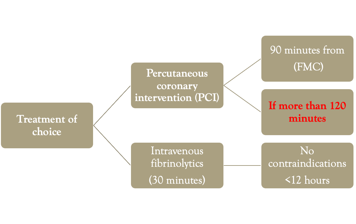 Primary percutaneous coronary intervention (PCI) has emerged as the gold-standard treatment for STEMI but is not available in all centres. Thrombolysis should be performed in patients without access to primary PCI 18