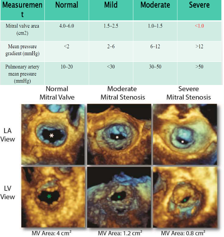 • MVA, valve pressure gradient, and presence or absence of symptoms and pulmonary artery hypertension are used to grade the severity of disease