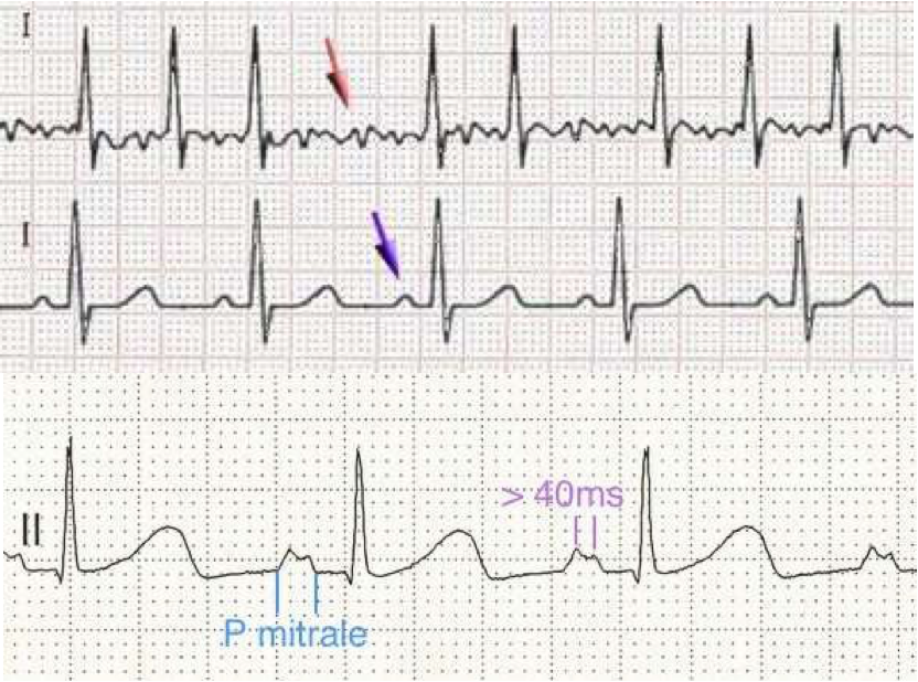 • BROAD NOTCHED “P” WAVES SIGNIFYING ATRIAL ENLARGEMENT.