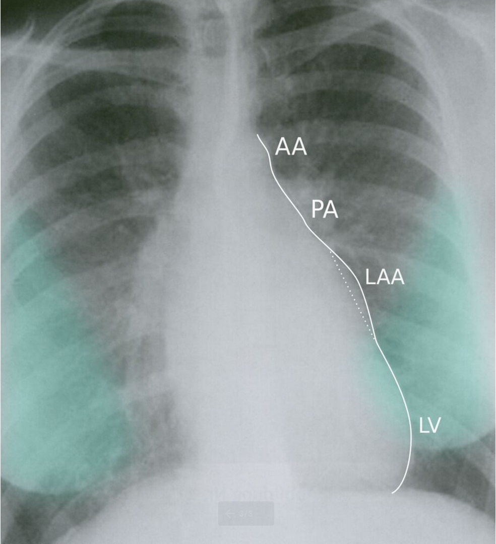 • Left heart border is straight or convex