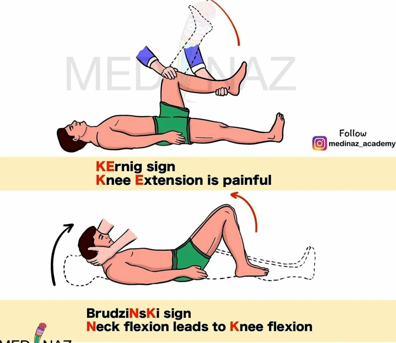 • Kernig sign—inability to fully extend knees when patient is supine with hips flexed (90 degrees) caused by irritation of the meninges. Only present in approximately half of patients with bacterial meningitis