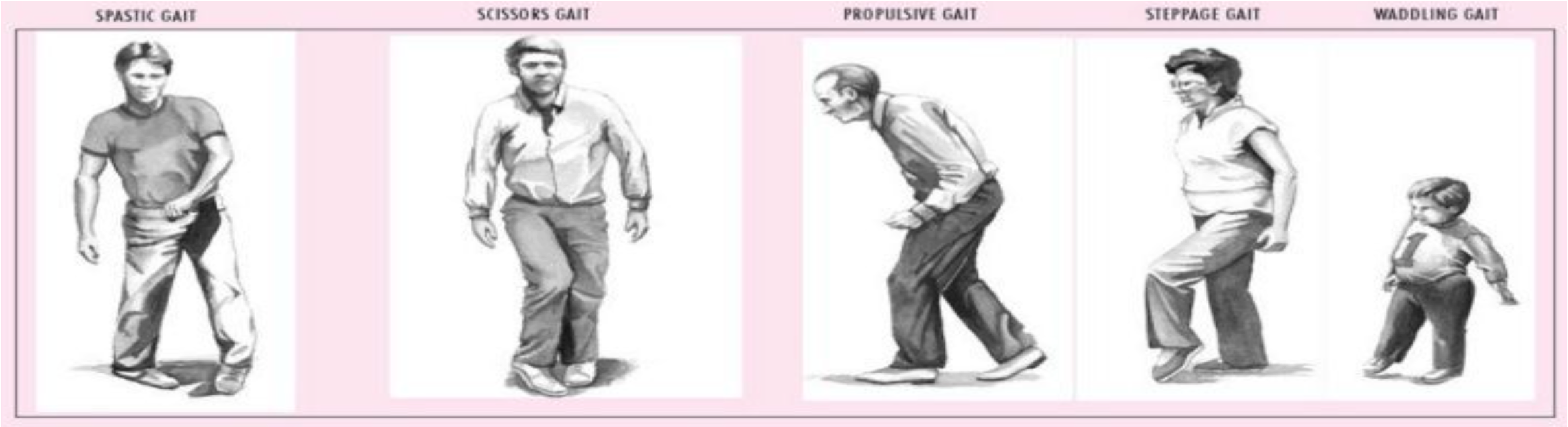 Hemiplegic GaitOne leg is stiff and swings in a semicircle, with the arm on the same side flexed.- Stroke