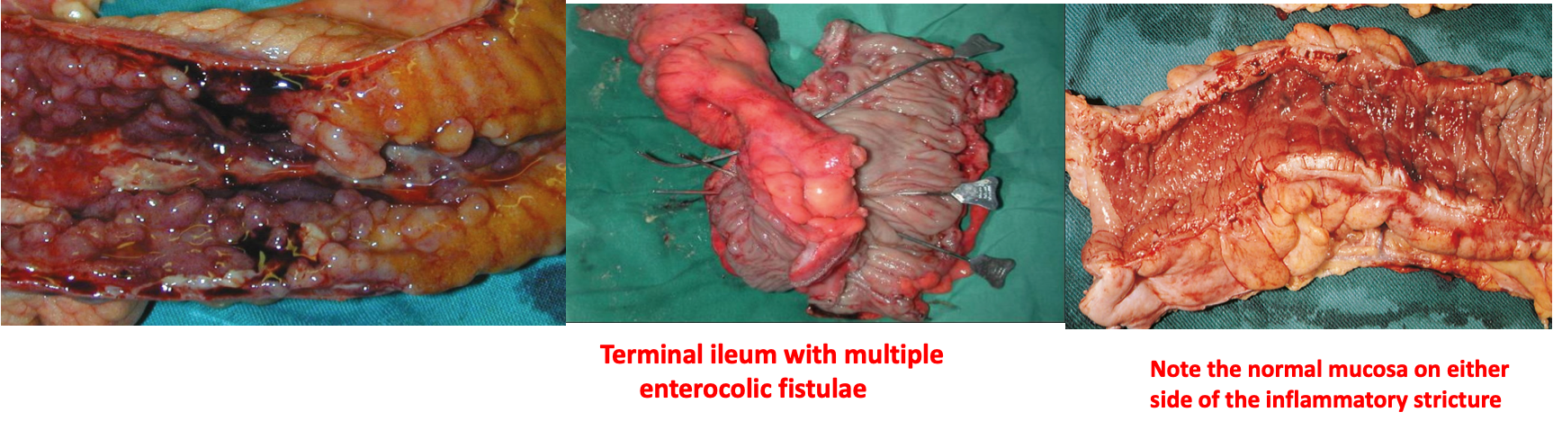 Fistula formation between the intestine and other nearby structures like other intestinal lobes, skin, perianal region - could be from lobe to lobe of intestine; consequence= malabsorption | may open directly to the skin | may open to the urinary bladded with UTI’s; nematourea? cc | may open to the vagina recurrent infections | most likely on perianal fistulas