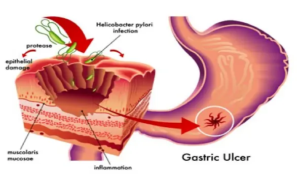 infection of the stomach specially in the duodenum with helicopacter pylori (G-ve bacilli)