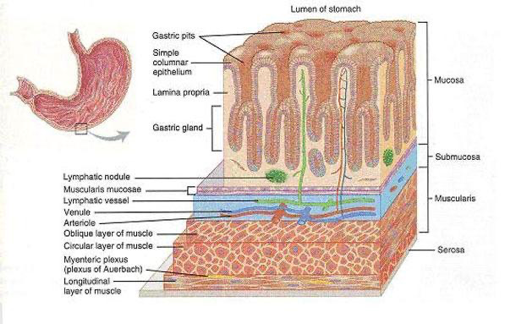 So, mucous and bicarbonate form protective gel like over the mucosa which with the epithelial cells tight junction form mucosal barrier which prevent (back diffusion of acid (H) , also Na and K diffusion to gastric mucosa)