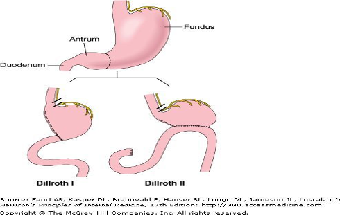 Truncal vagotomy and antrectomy, bowel continuity is maintained by Billroth I or Billroth II anastomosis. Billroth II gastrectomy has higher mortality and morbidity.