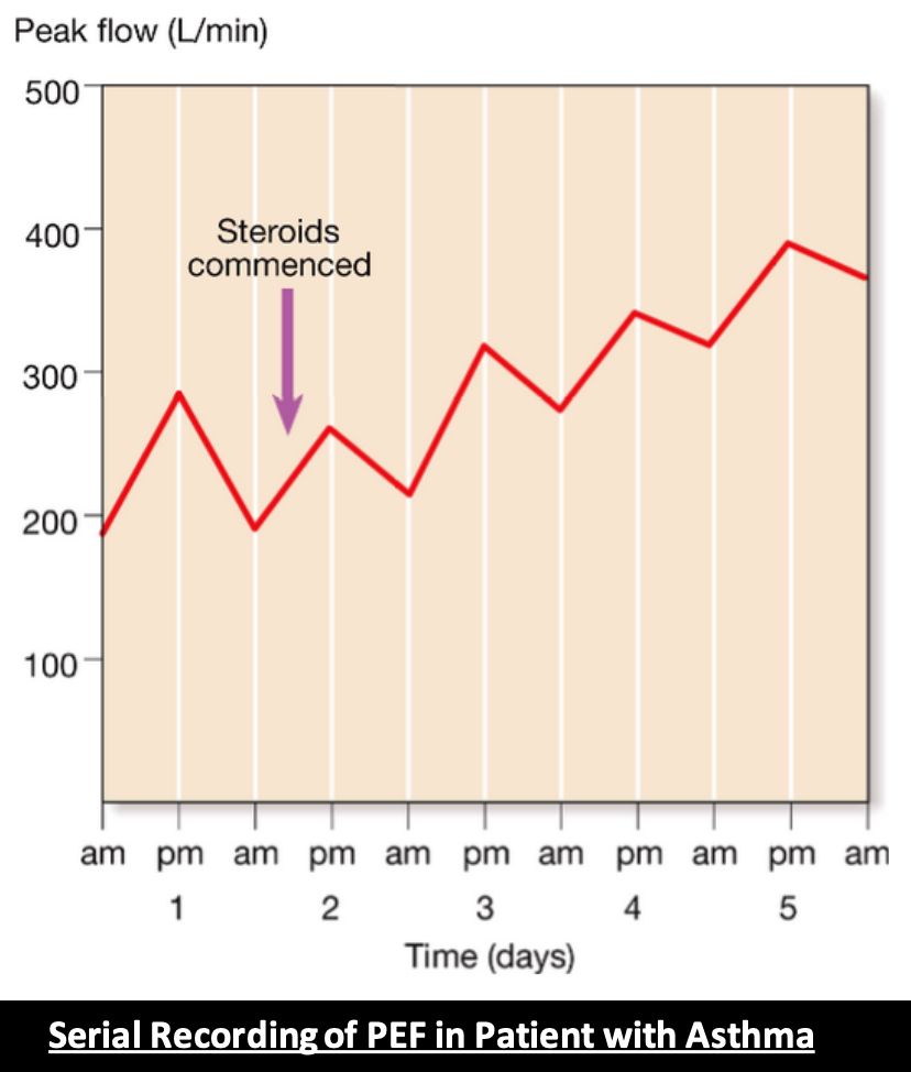 - Patients are advised to record peak flow reading after arising in the morning and before retiring in the evening