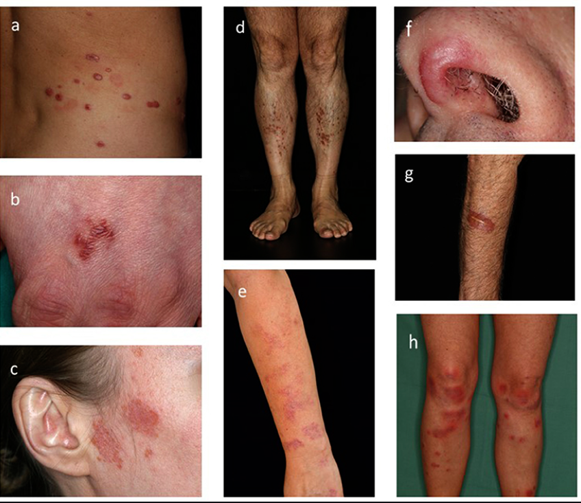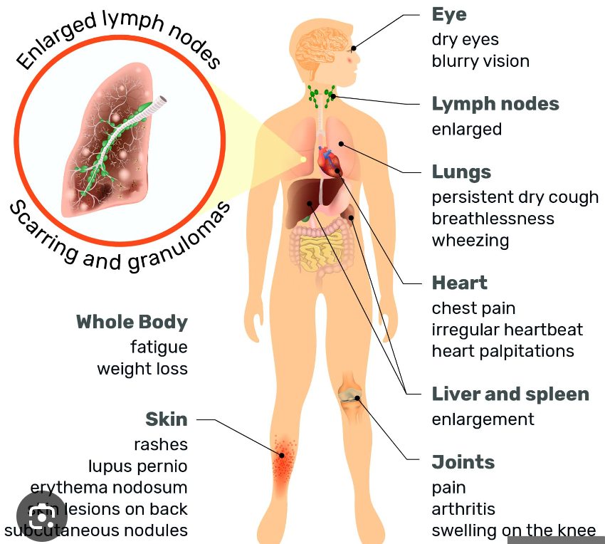 - Skin: Erythema nodosum, lupus pernio, maculopapular rash.