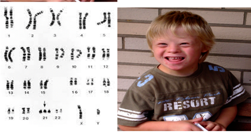 Translocation (5%): translocation from 21 combination with 14 - may appear normal, with all chromosome intact, but abnormality in length, or combined with 21 it self.