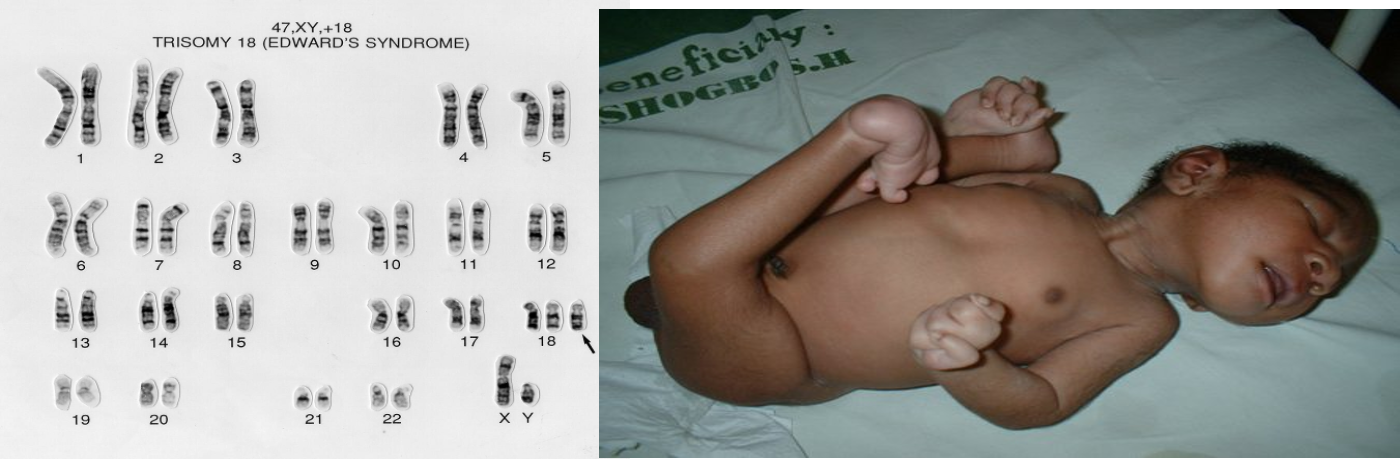 | Trisomy 18 (Edward Syndrome) | Microcephaly, high forehead, rocker bottom feet, clubfoot, overlapping fingers, hypoplastic nails | Apneic episodes, poor feeding, failure to thrive, intellectual disability, heart defects (VSD, ASD, PDA) | Risk of recurrence <1%, higher with increased maternal age | None specified | Supportive care, management of symptoms | |