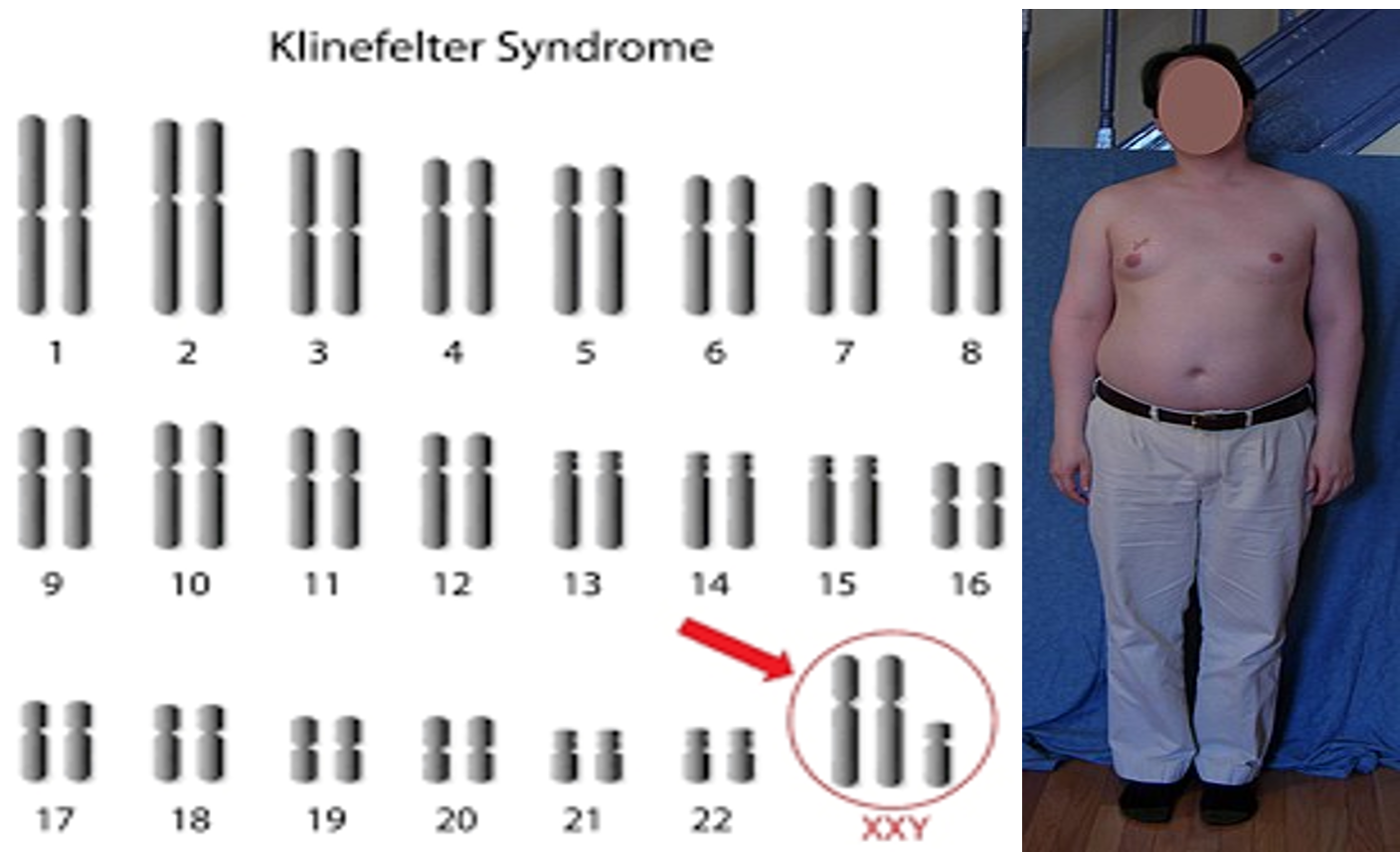 | Klinefelter Syndrome (47, XXY) | Tall stature, gynecomastia, small penis, infertility, delayed secondary sexual characteristics | Language impairment, academic difficulty, osteoporosis, hypogonadism | 47,XXY karyotype with variants | Increased risk of pulmonary disease, varicose veins, ADHD | Testosterone replacement therapy | |