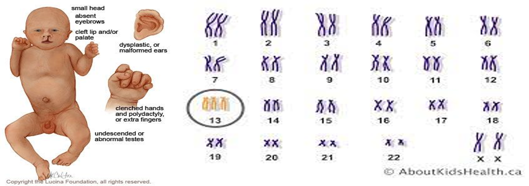 | Trisomy 13 (Patau Syndrome) | Cleft lip/palate, polydactyly, microcephaly, microphthalmia, scalp defects | Cardiac defects (PDA, VSD), genital anomalies, neural tube defects | Risk of recurrence <1%, higher with increased maternal age | Omphalocele, hernias | Supportive care, management of symptoms | |