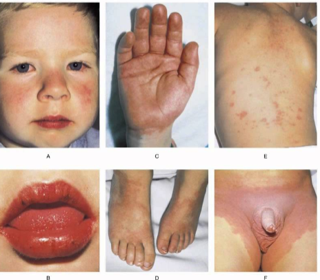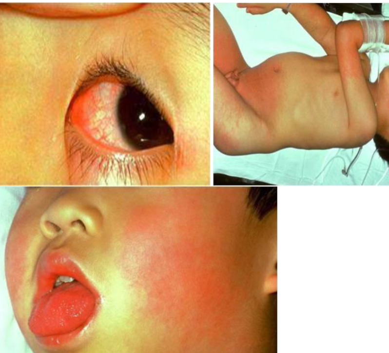 - Erythema and cracking of lips, strawberry tongue