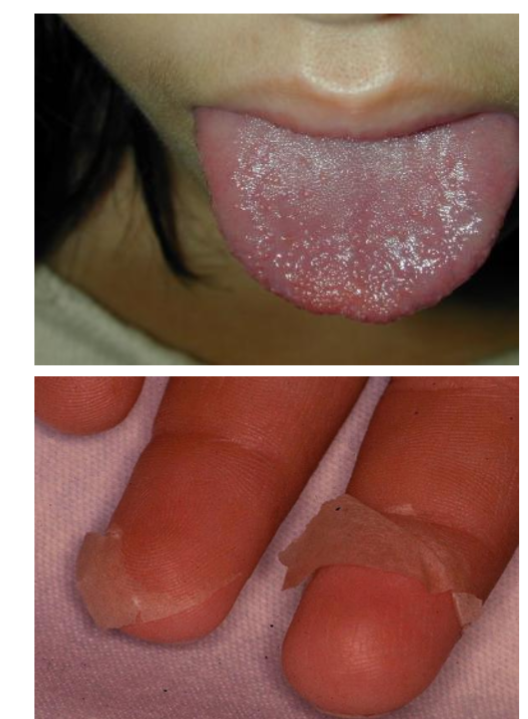 1st Sign ? Kawasaki disease 2nd sign ? Finger skin peeling Diagnosis ? Strawberry tongue.