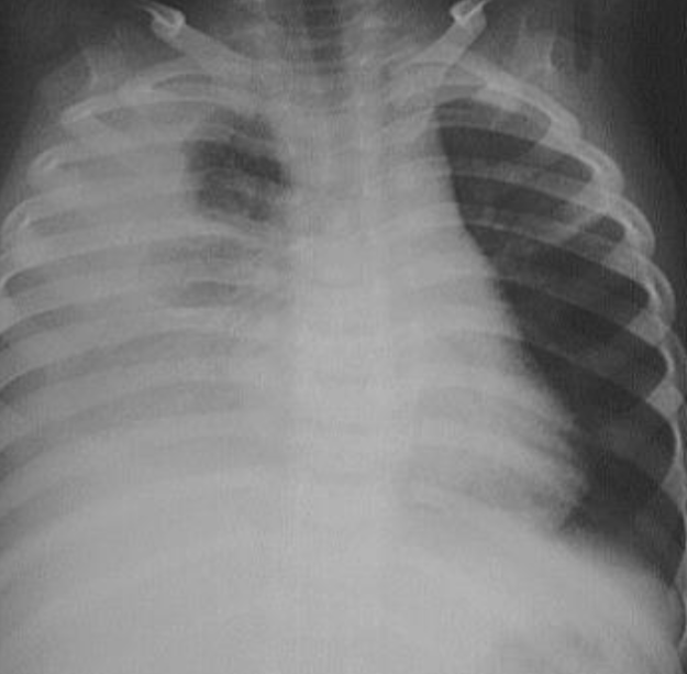 - The physical examination of the chest will not show the typical signs seen in ,adult, however, limitation of movement and plugging of the right hemithorax displaced heart sounds more laterally and absent air entry over the right side .can be found