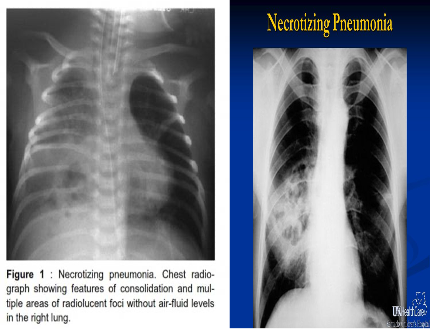 - Necrotizing pneumonia, necrosis, and liquefaction of lung parenchyma, is a serious complication of community-acquired pneumonia (CAP).