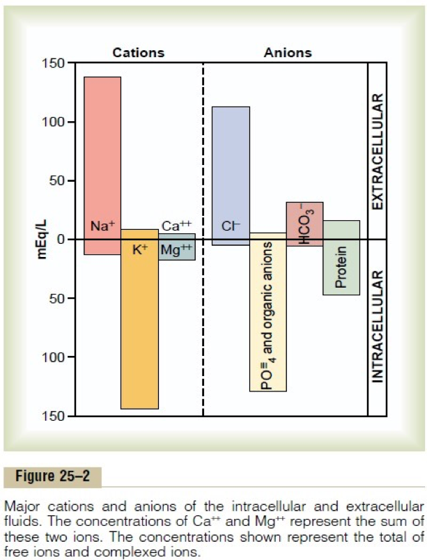 - Extracellular Fluid: Main cation is Sodium (Na = 135 - 145 mEq/L), regulated by RAAS.