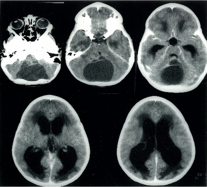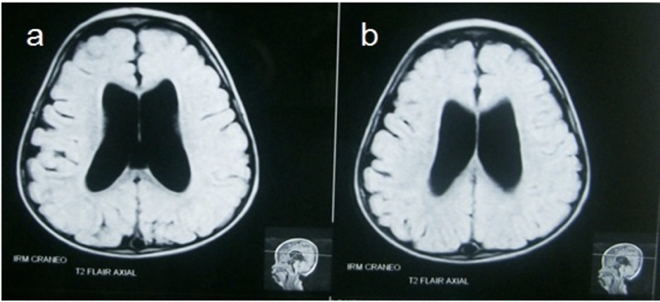 of a young child with Dilated lateral ventricles are seen in the center of both images.