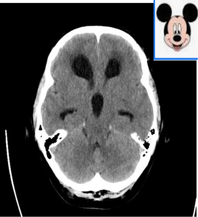 - Mickey Mouse ventriclesĀ (enlargedĀ lateralĀ andĀ third ventricle)