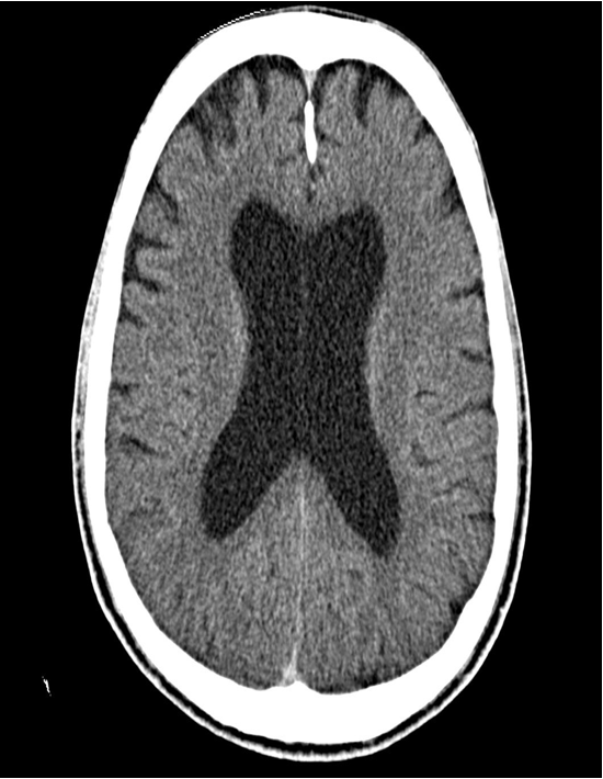 Significant enlargement of the lateral ventricles. The anterior falx cerebri appears hyperdense due to calcification.