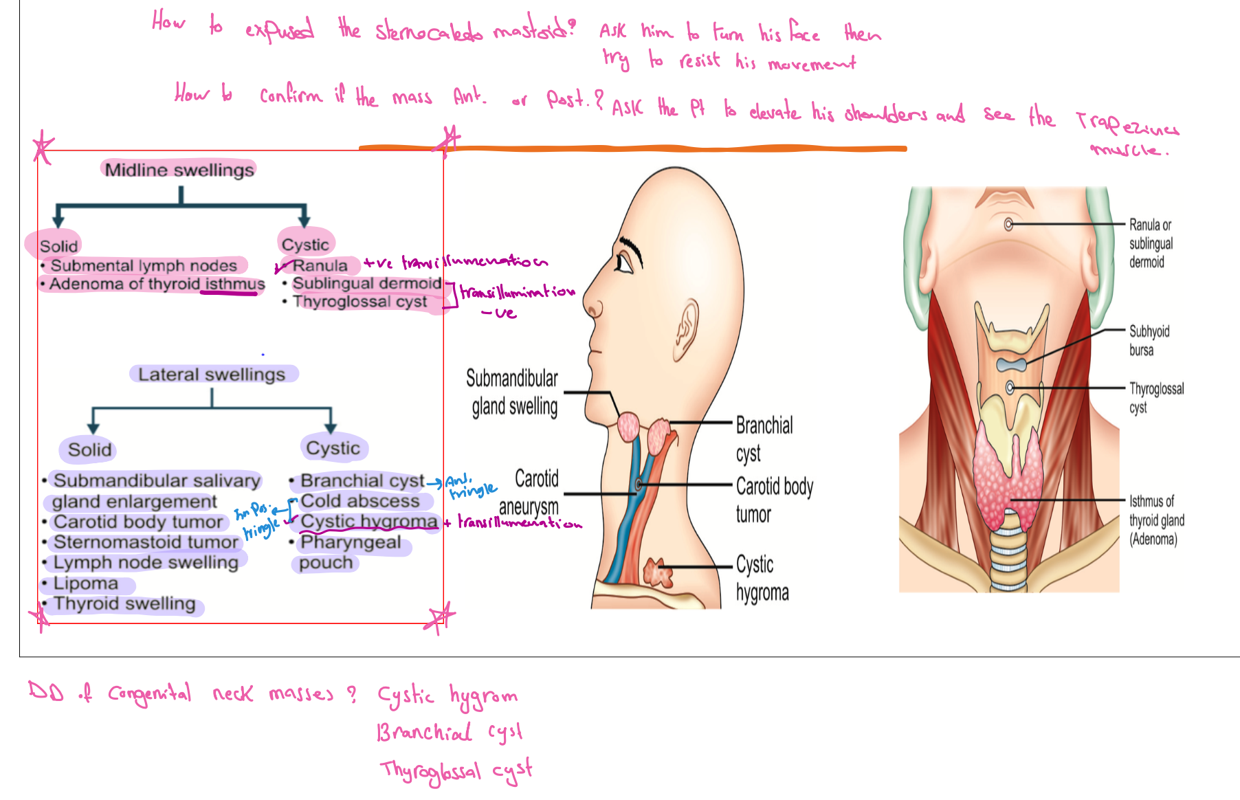 Movement from swallowing (This indicates it is deep to the pretracheal fascia and likely to be thyroid. (thyroid, lymph nodes pretracheal fascia)