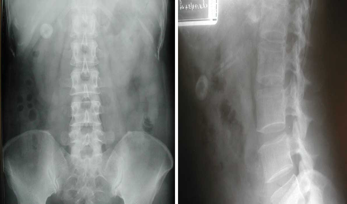 - radioopaque shadow on RUQ - renal stone