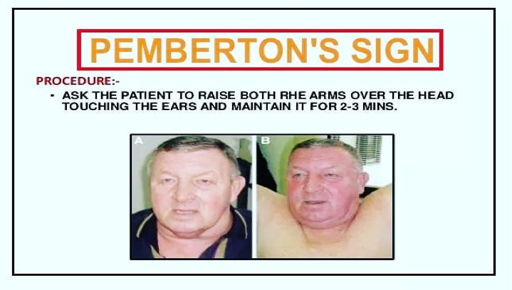 Pemberton’s sign is used to evaluate venous obstruction in patients with goiters. The sign is positive when bilateral arm elevation causes facial plethora. It has been attributed to a “cork effect” resulting from the thyroid obstructing the thoracic inlet, thereby increasing pressure on the venous system.
