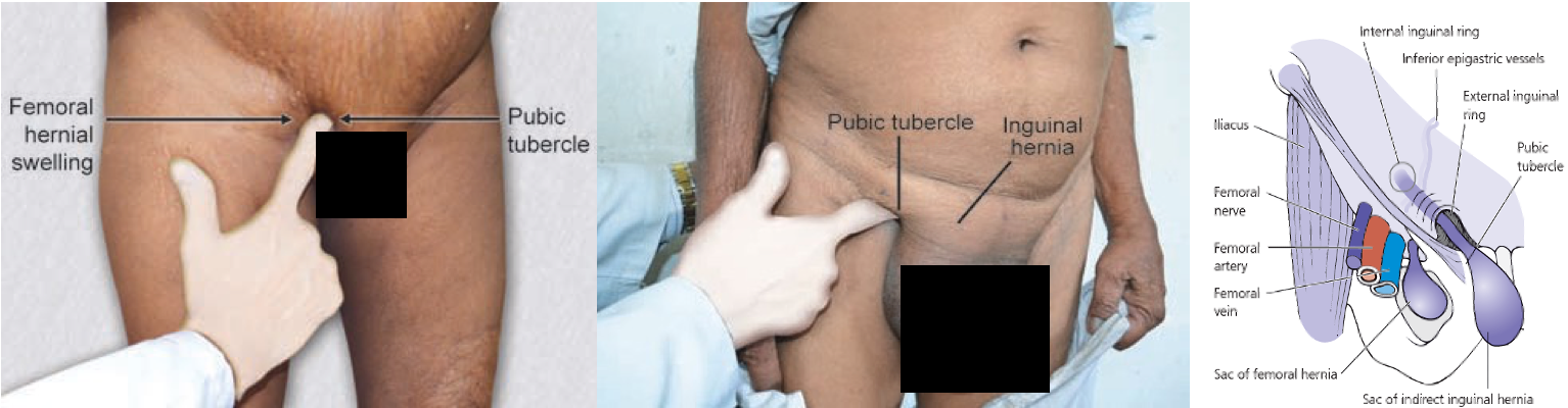 - Examination: Put a finger tip over pubic tubercle (How to find it?) IH- above & medial FH- below & lateral