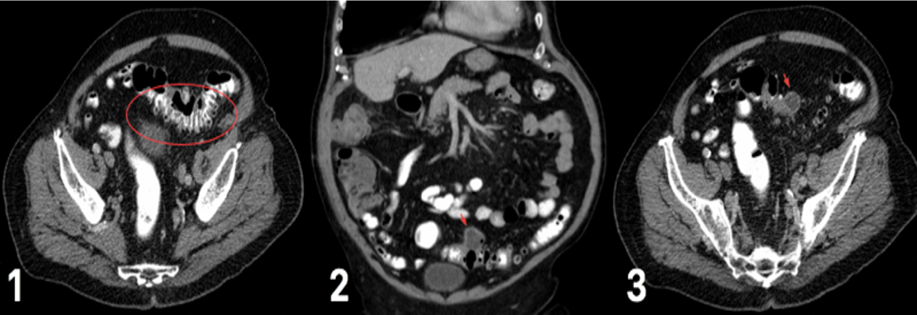 CT scan for varying degrees of diverticular disease (1) diverticulum in the sigmoid colon (2) degree of diverticulitis present (3) abscess formation, secondary to ongoing diverticulitis