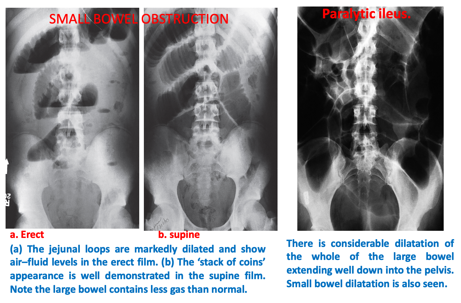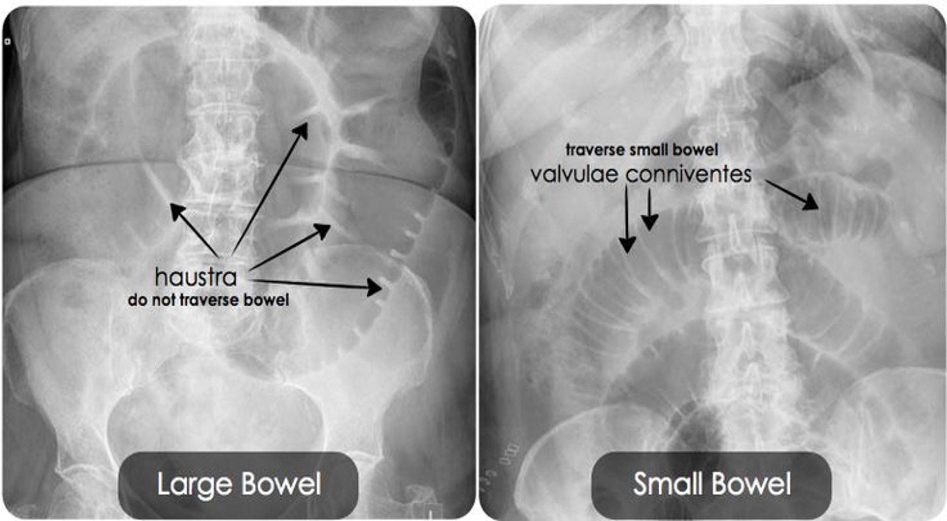 Dilatation of bowel loops proximal to the obstruction: 3-6-9 rule :To help guide the identification of bowel dilatation on imaging. Transverse diameter greater than the following indicates dilation: Small bowel > 3 cm Large bowel > 6 cm Cecum > 9 cm