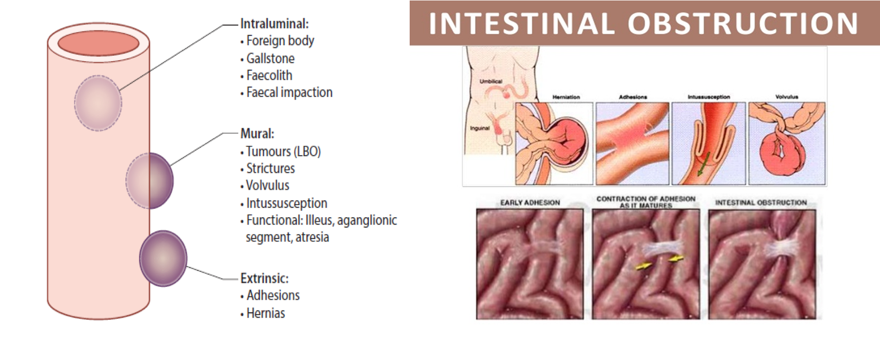 - Extramural: adhesion, hernias, volvulus, intussusception, tumors