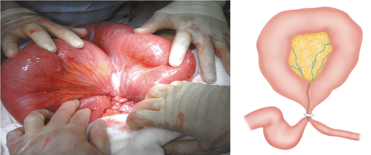 | Symptoms | Obstruction w/ Severe colicky central abdominal pain, distension, early vomiting, and constipation | Lower abdominal colic & obstipation followed by distension | Short history of distension & vomiting against background of pain & constipation | Incomplete obstruction |