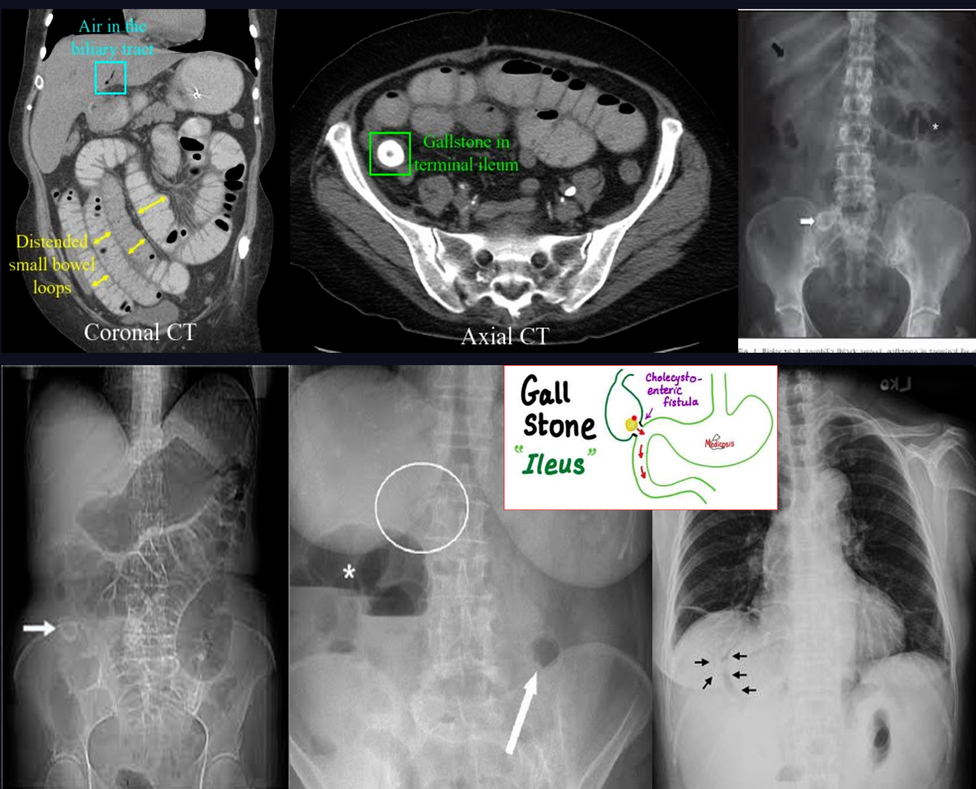 - Pneumobilia; air in gallbladder due gallstone ileus // C. deficelle also Z