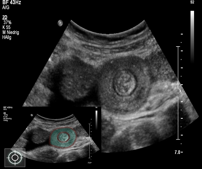 Concentric alternating hyperechoic and hypoechoic rings are visible. The hyperechoic rings (green overlay) are formed by mucosa and the hypoechoic rings (red overlay) by submucosa. Together the alternating layers produce a target-like appearance (target sign; bullâs eye sign).
