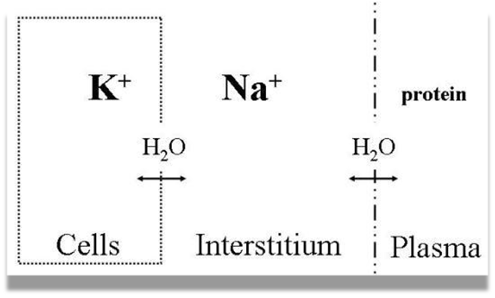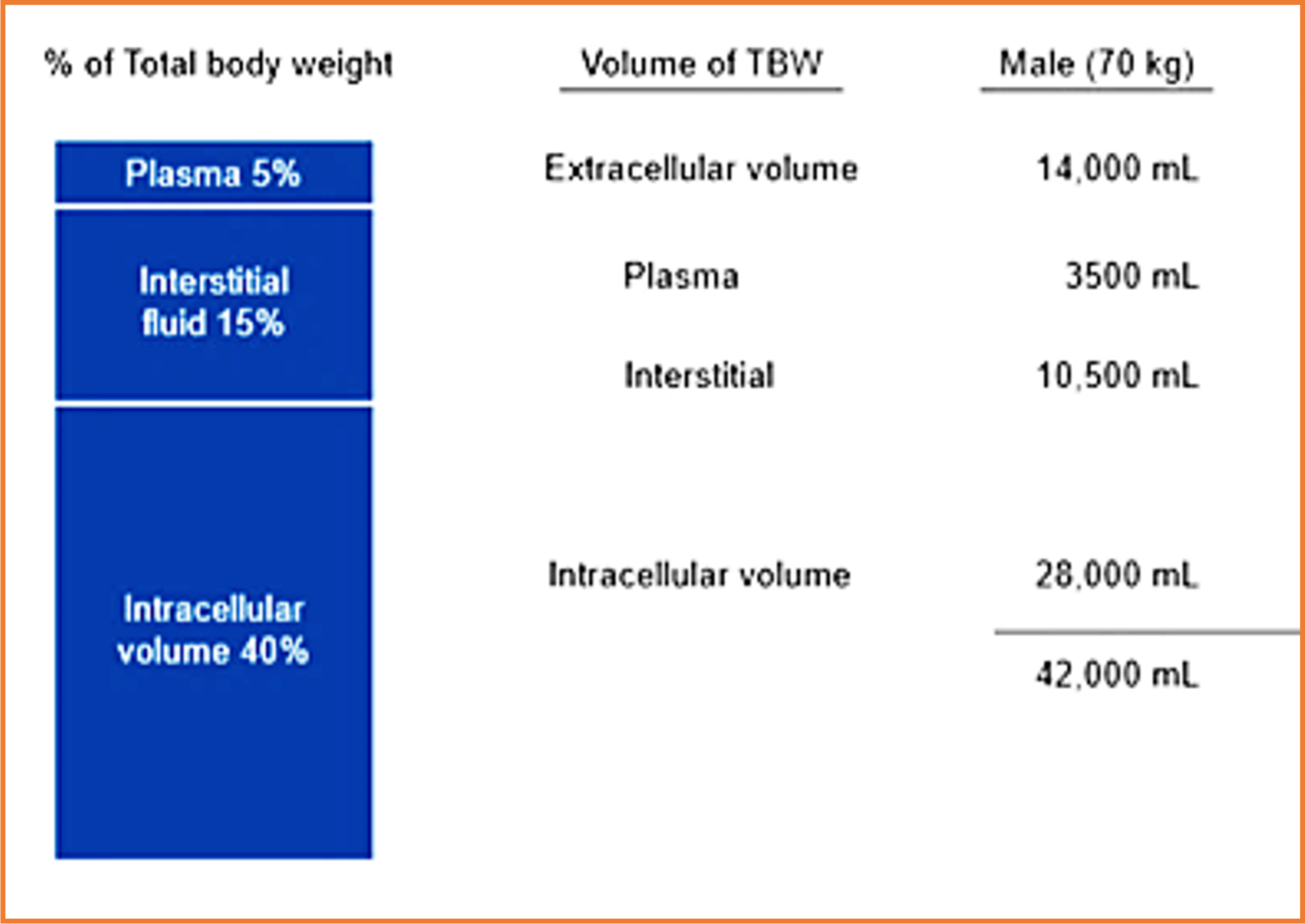 Intracellular 40%, Extracellular 20% Interstitial: 15% Intravascular: 5%