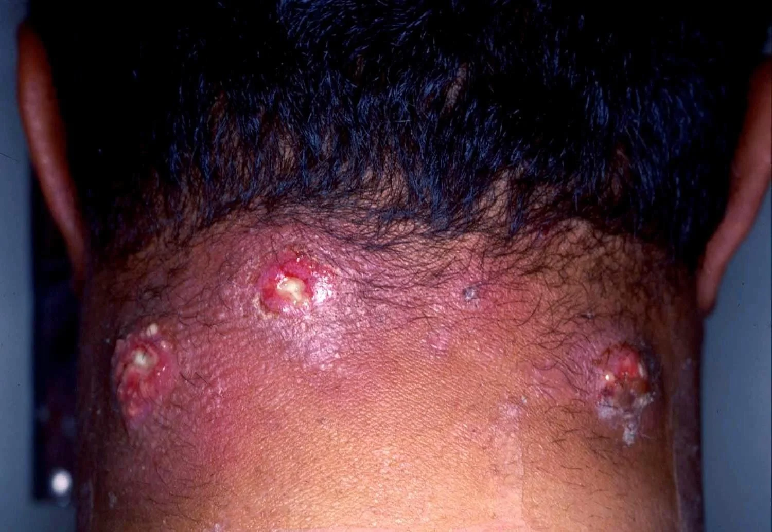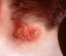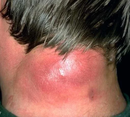 - A group of adjacent hair follicles becomes deeply infected with Staphylococcus aureus, leading to a swollen painful suppurating area discharging pus from several points.