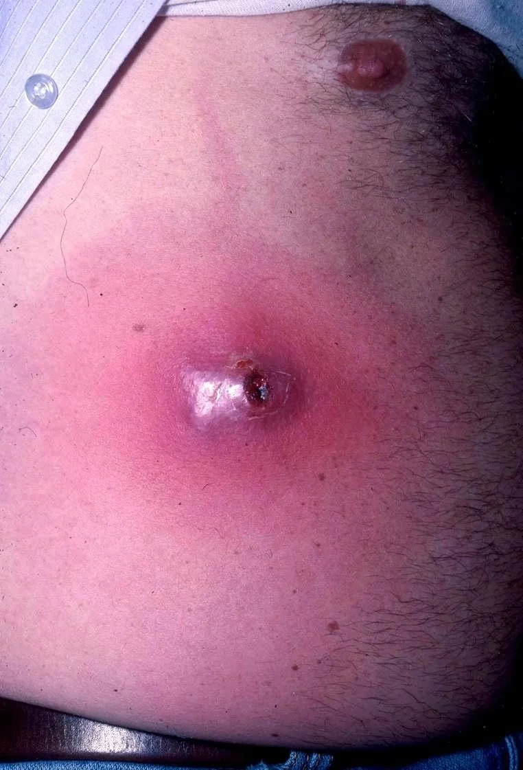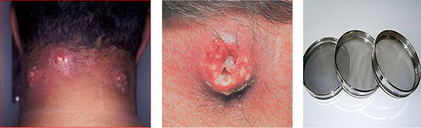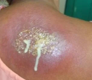 Clinical Features: The skin over the area is red and dusky, multiple vesicles appear on it, which burst on the surface, one after another bringing out a purulent discharge. Thus, the surface looks sieve – like.