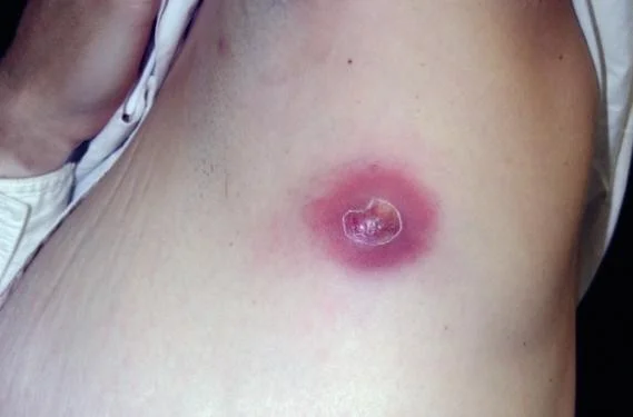 - Begins as a firm, tender, erythematous nodule that becomes fluctuant and painful and commonly ruptures spontaneously and later may discharge pus.