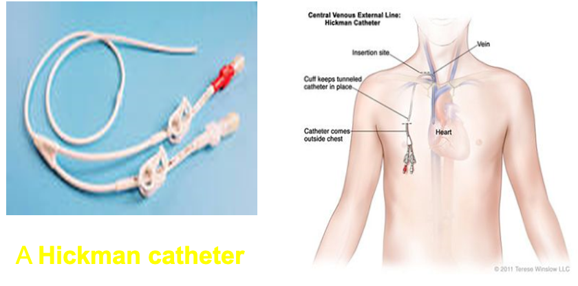 TPN or CVN (Central venous route), when chosen, the catheter should be inserted via(access) either the subclavian, internal or external jugular vein and is tunneled subcutaneously to minimize the risk of infection.