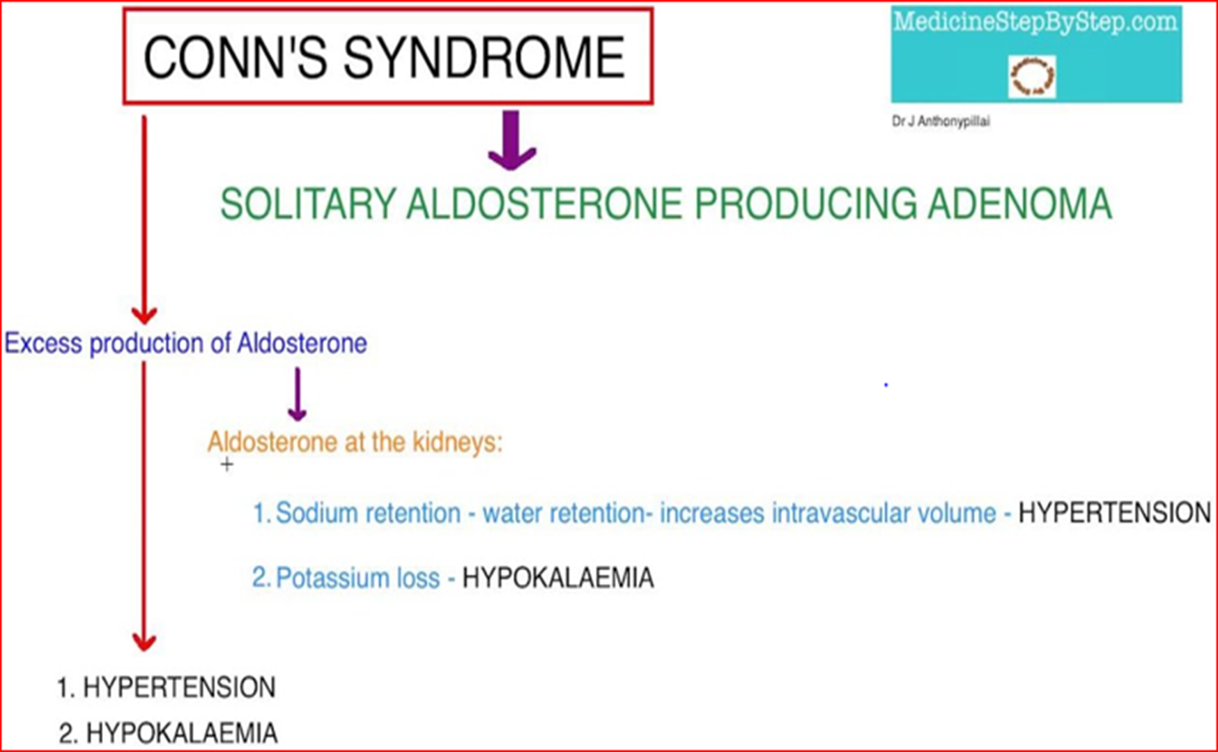 Too much aldosterone secretion Usually caused by an adrenal tumor